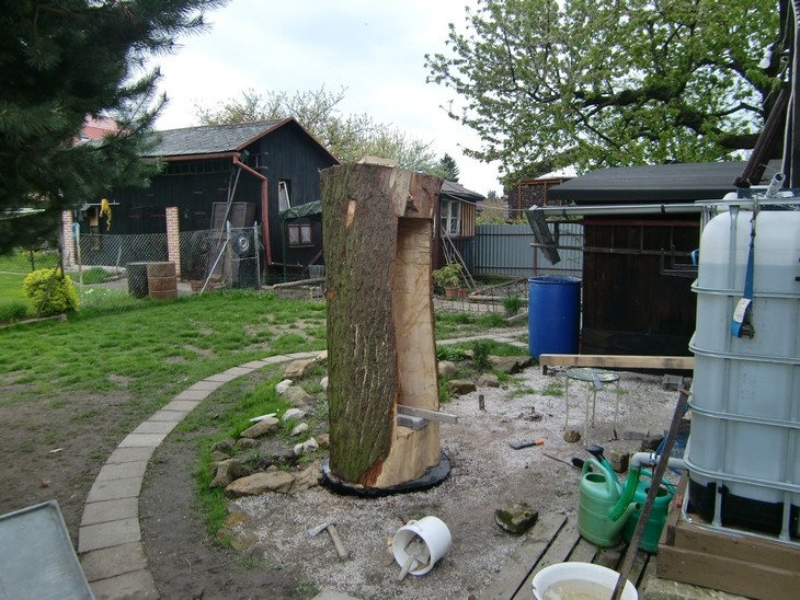 Dostal jsem od kamaráda kmen kaštanu a délce 220cm x 80cm. Po zaříznutí jsem se dostal na rozměr 190cm x 80cm. Jelikož je kmen v průměr spíše elipsa, tak můžu jít do hloubky cca 36 cm. Zbytek nabude pak ještě klínem / zárubní, který se musí udělat, aby se kmen srovnal do stejné hloubky. Naštěstí to nebude mít rušivý vliv. Zadní strana bude pod střechou včelnice.