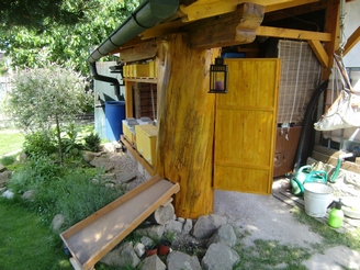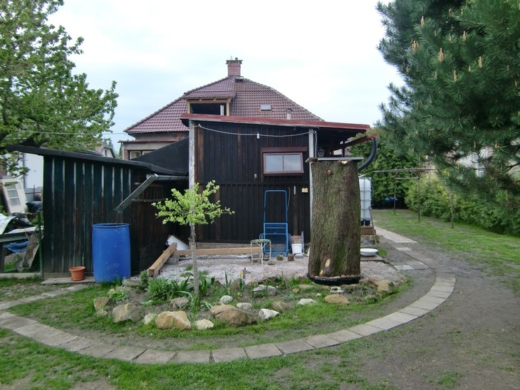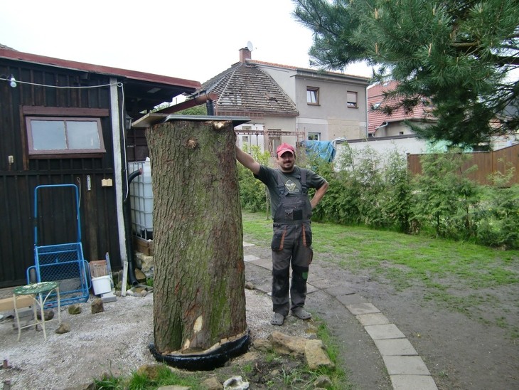 Tak, a jdeme na to. Vybetonoval jsem podstavec a dal dvě vrstvy lepenky. Pak už stačilo přemluvit celou stavební partu. Ještě, že soused staví. Dostavil jsem se z bezelstným úsměvem, jestli nemají 5 minut :-) No, a stojí na svém místě. Je trošku dominantní v té malé skalce, ale, až se na něj položí trám 30x30 a vztyčí konstrukce, tak to bude pěkné.
